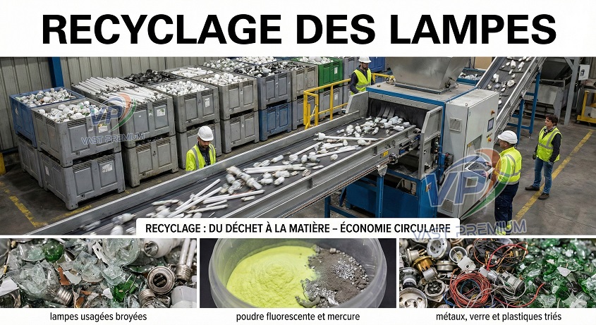 Valorisation de Matière : Eurl Vast Premium est prête à collecter tous types de lampes, tube Néon, Lampes fluorescentes, Lampes LED, seront collectés dans des cartons, et envoyés aux Traiteur Recycleurs Agréés,