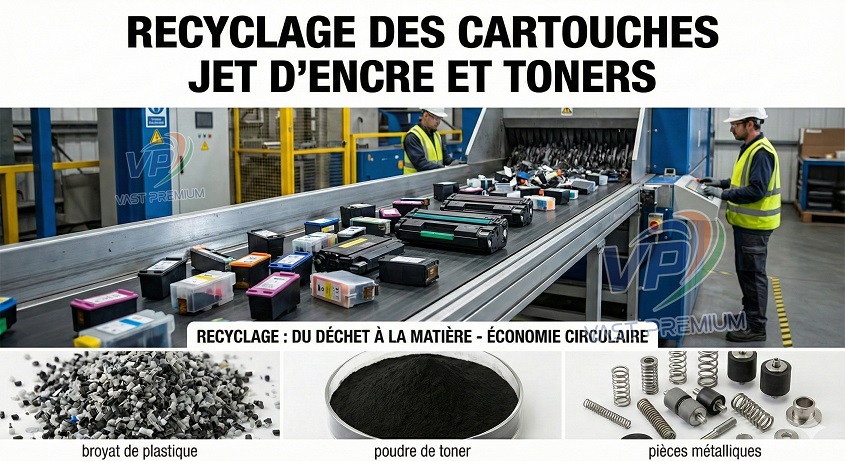 Les cartouches jets d’encre et les toners peuvent être réutilisés après leur premier cycle de vie. Eurl Vast Premium est spécialisée dans la Collecte des Cartouches jets d’encre et Toners usagés des entreprises, nous assurons leur élimination par Recyclage ou Incinération écologique.