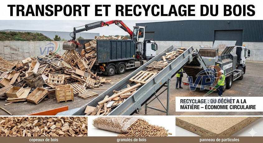 Valorisation de Matière : Le Bois collecté des sociétés est recyclé, réutilisé ou Broyé. Le Bois Contaminé est incinéré.